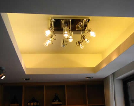现代住宅普遍层高都在2.8米左右,如果客厅屋顶再采用造型天花来装饰,就会因屋顶压得太低而让人有强烈的压迫感。对于这种情况,可采用四边低而中间高的天花造型,这样一来,不但视觉上较为舒服,而且天花板中间的凹位形成聚水的“天池”,对住宅大有裨益。若再在聚水的“天池”中央悬挂一盏金碧辉煌的水晶灯,则会有画龙点睛之效,但切勿在天花板上装镜。另外,吊灯也不宜有尖锐的形状。